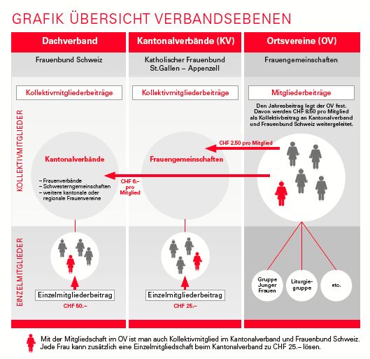 Der Frauenbund organisiert sich auf drei verschiedenen Ebenen: schweizerisch, kantonal und ortsgebunden.